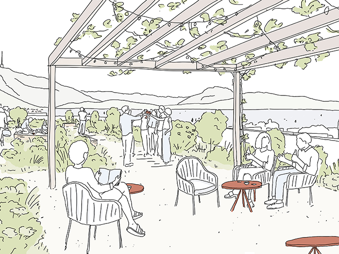 Aufgewertete und attraktiv gestaltete grüne Aussenräume schaffen Orte der Begegnung und neue Treffpunkte. Die Freiräume werden vergrössert und begrünt. Grosse Bäume auf dem Metalliplatz schaffen eine attraktive Atmosphäre, spenden im Sommer Schatten und verbessern das Stadtklima. Die öffentliche, parkähnliche Dachterrasse mit Blick auf Zugersee, Zugerberg und Alpen bietet Aufenthaltsbereiche, wo man sich auch nach Feierabend treffen oder einen schönen Sommerabend geniessen kann.