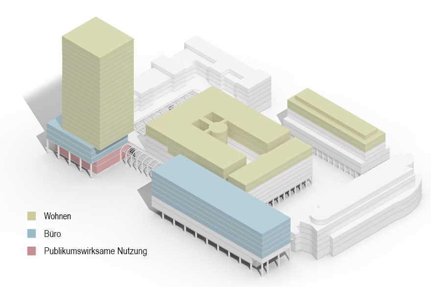 Mit dem gewählten Konzept können 85% der bestehenden Bausubstanz innerhalb des Bebauungsplanperimeters erhalten bleiben, was bei einer innerstädtischen Verdichtung mit deutlich höherer Ausnützung ein sehr hoher Wert ist. Ebenfalls erhalten bleiben die überdachte Ladenpassage sowie der glasüberdeckte Innenhof.